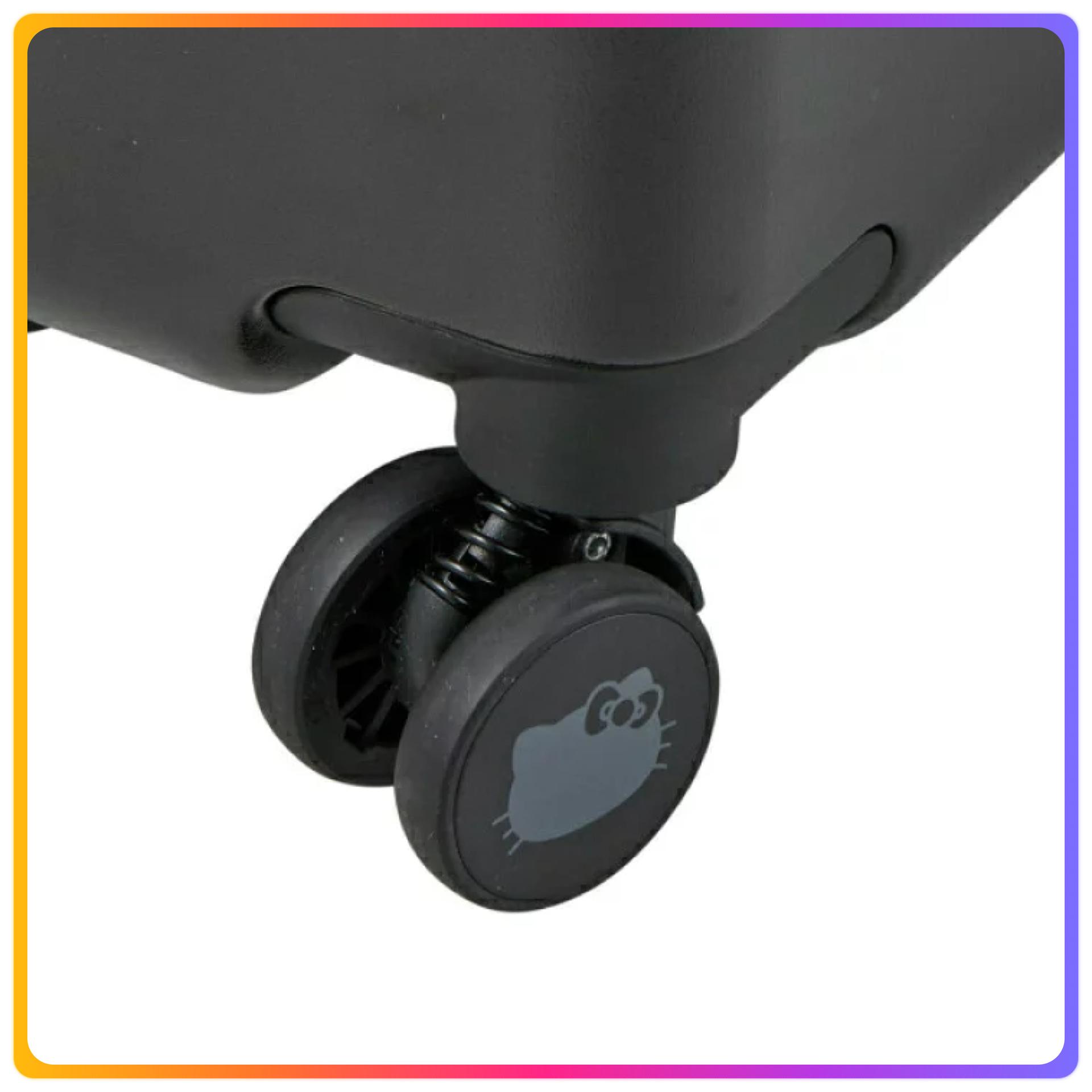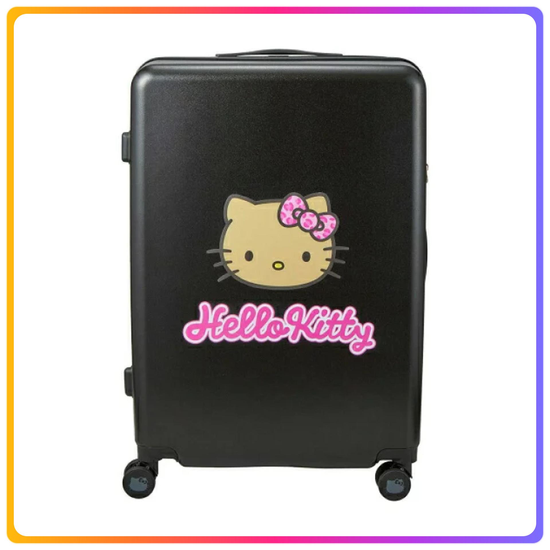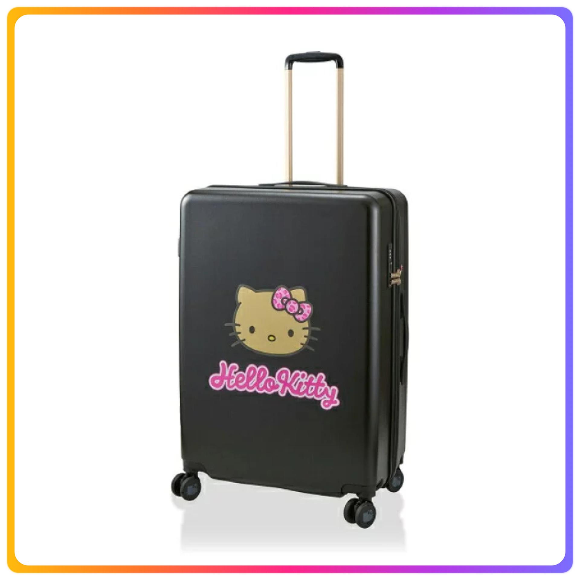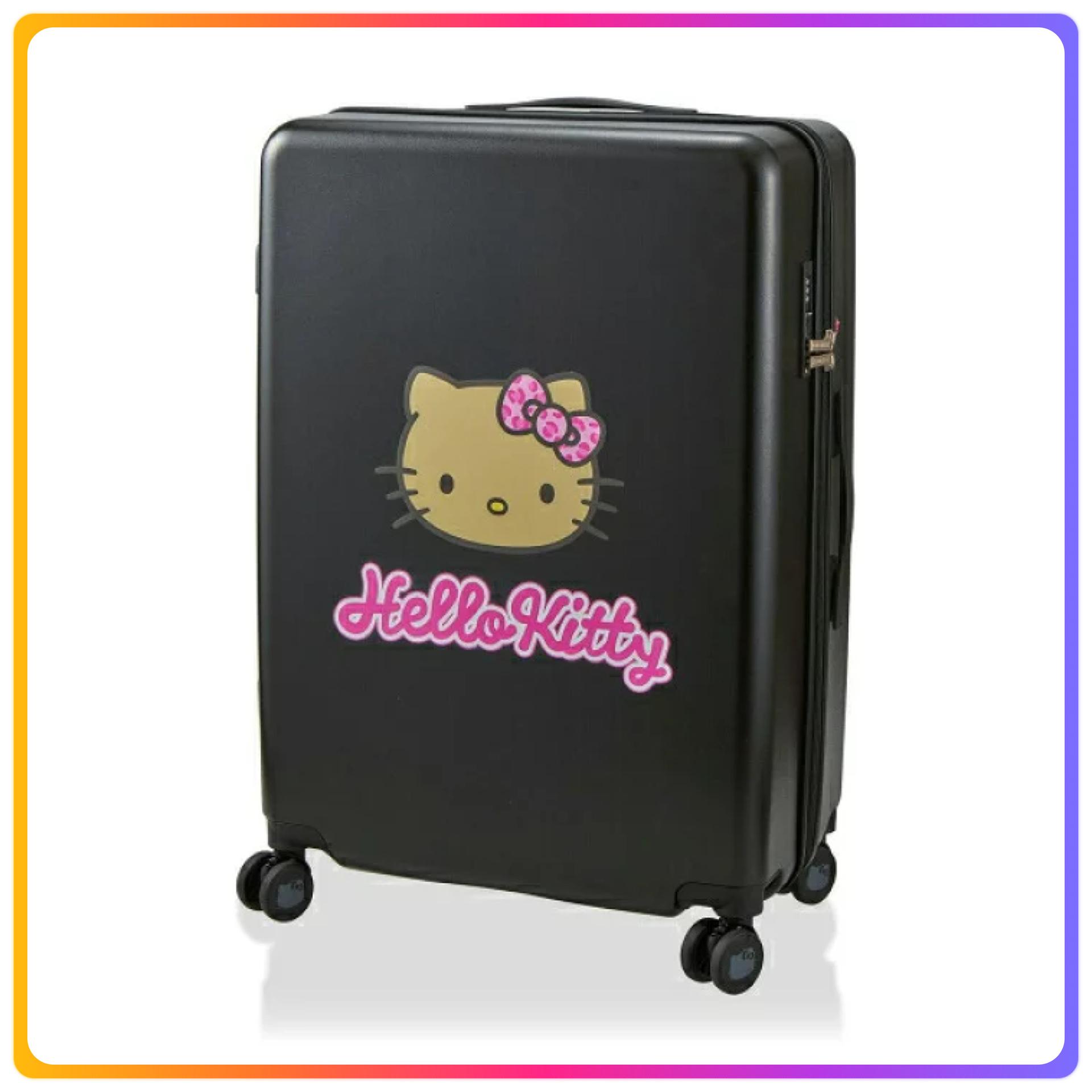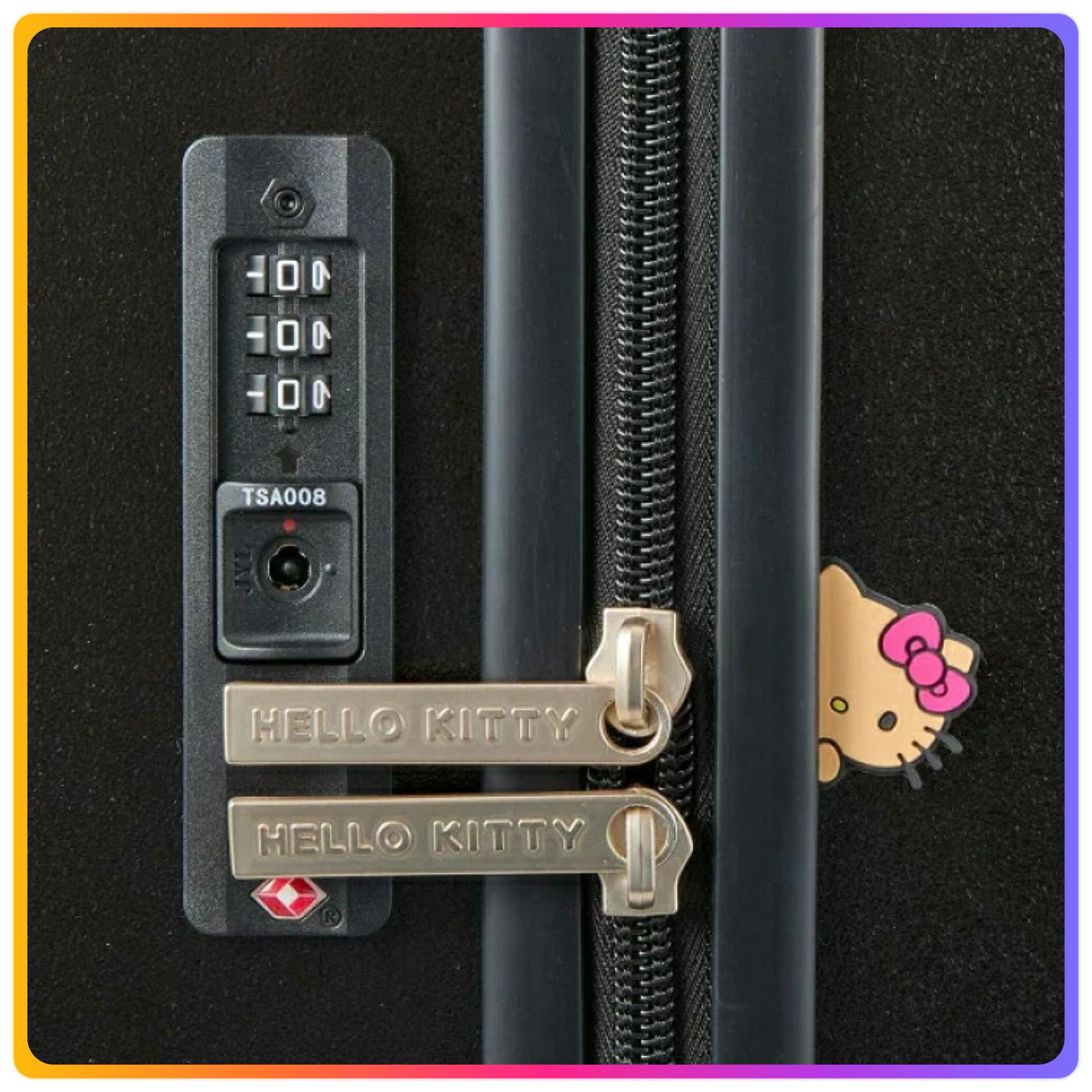 - 行李箱側面貼有偷看的Hello Kitty的標籤,拉鍊頂部刻有HELLO KITTY標誌
