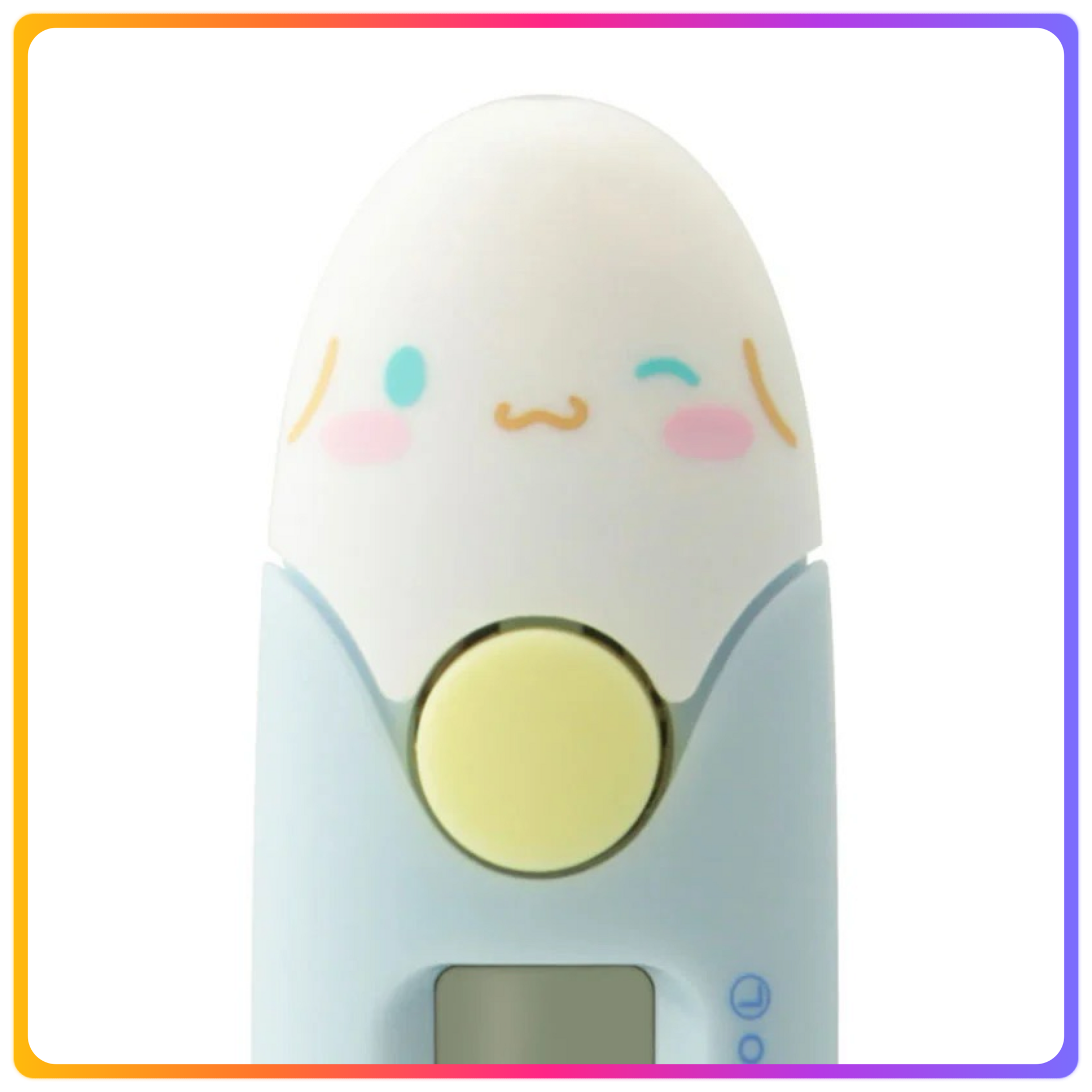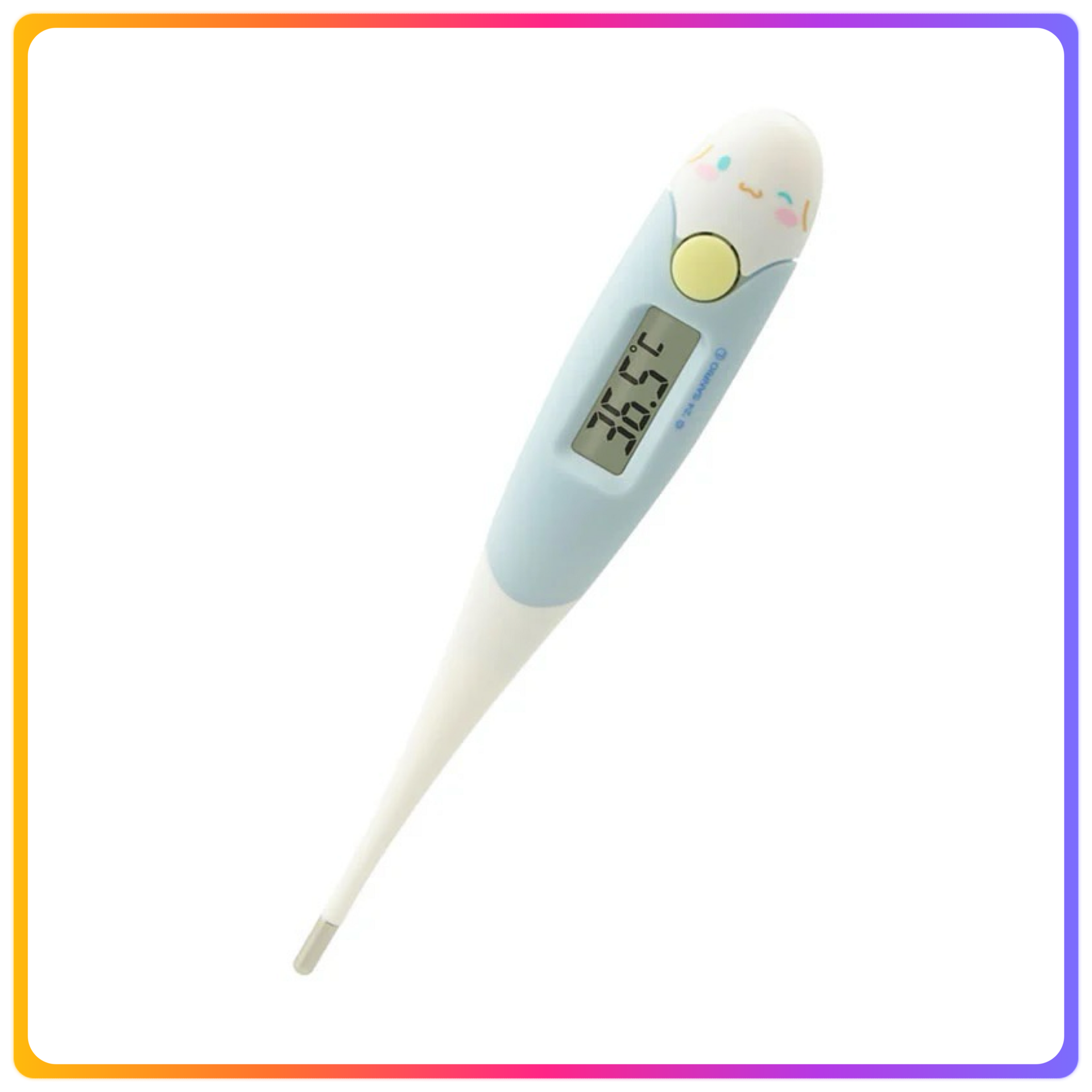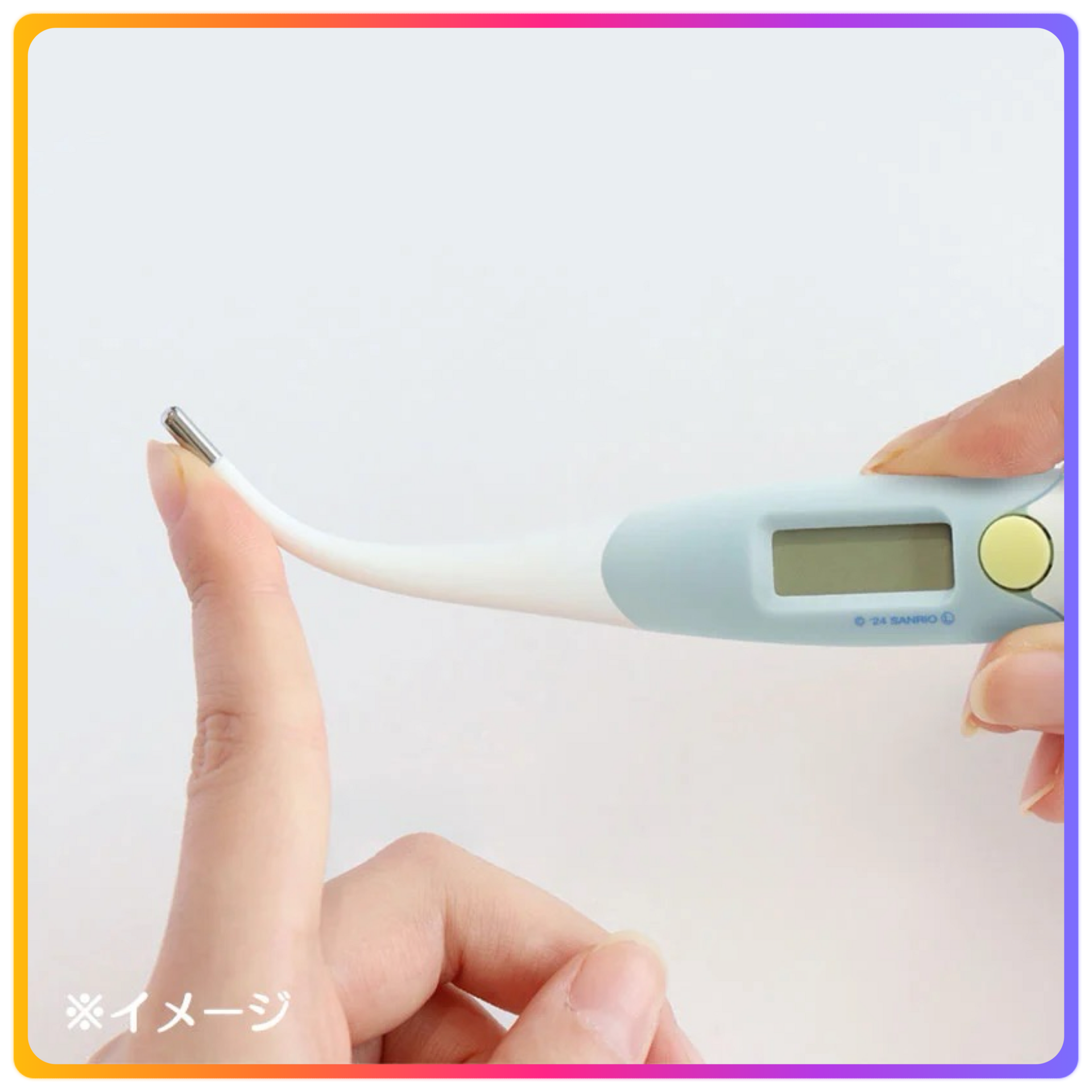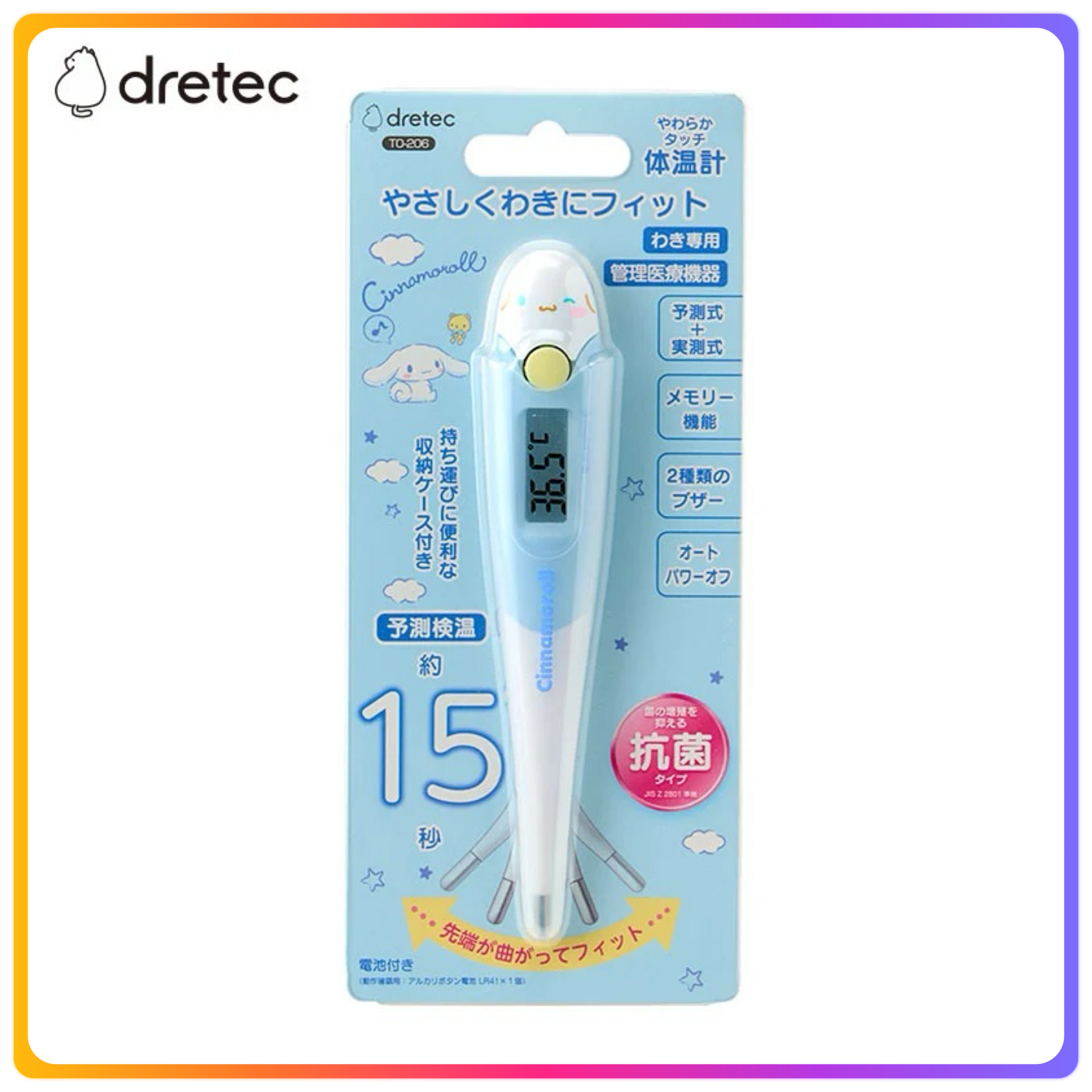- 下方約15秒預測體溫測量 - 因為尖端是卷的,所以輕輕地貼合在脇上 - 測溫結果在37.8℃以上時,請更改蜂鳴器的節奏通知 - 忘記關閉電源時安心的自動關機功能 - 因為是抗菌樹脂,所以可以乾淨地使用