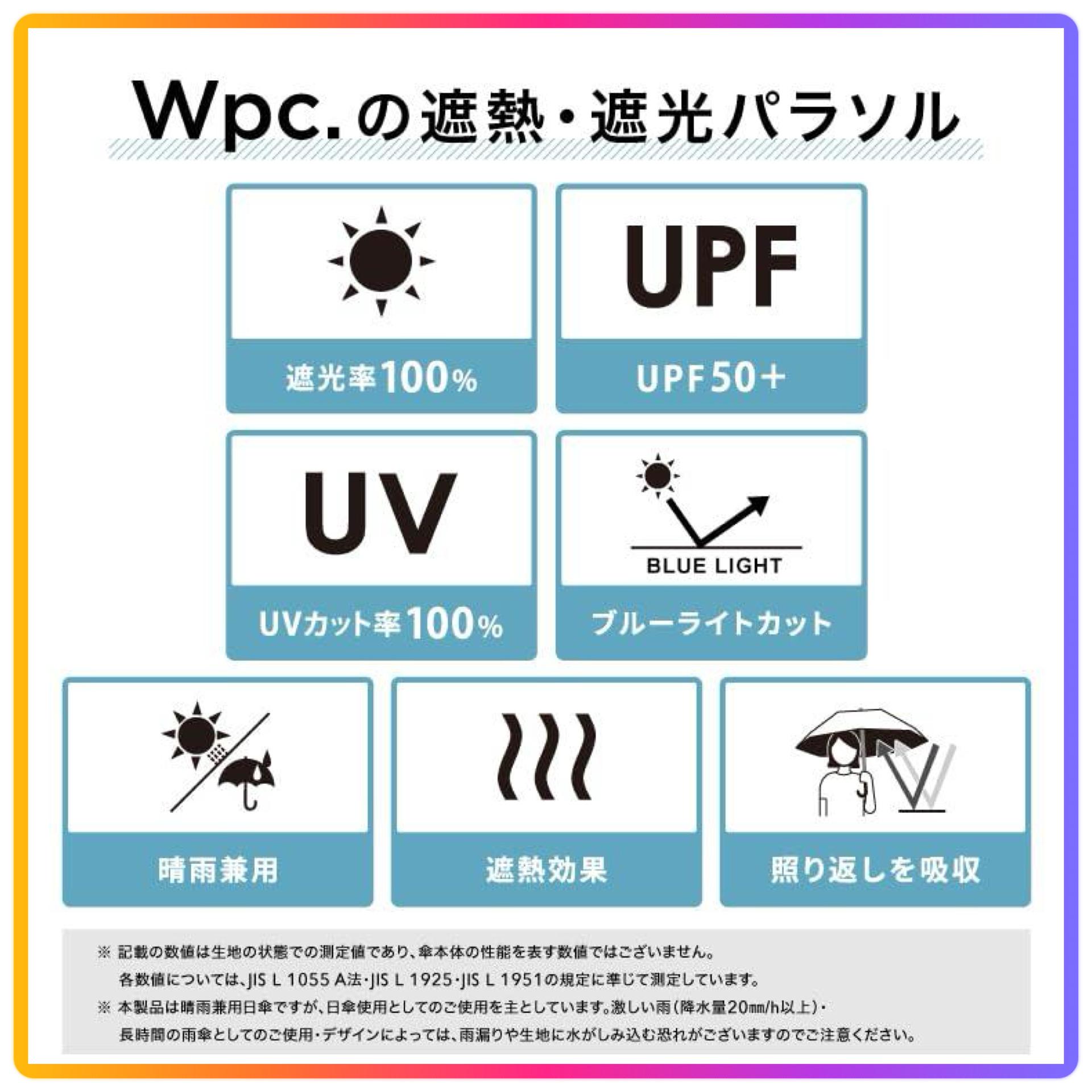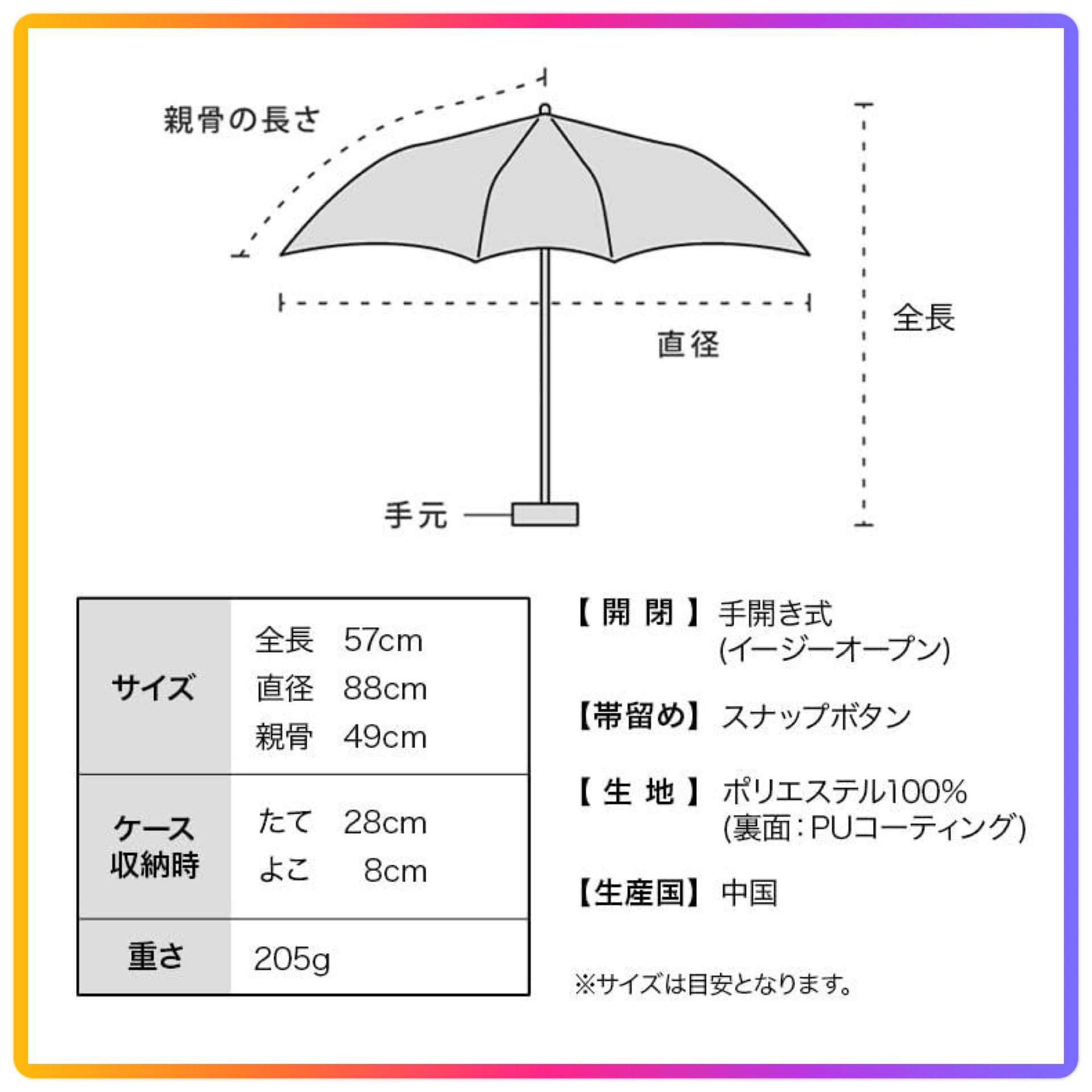 - 不管是晴天還是下雨天都可以使用,功能性也很出眾的太陽傘 - 採用3層式骨架的摺疊傘 - 彎曲方便拿在手邊 - 為了方便傘的進出收納袋完全遮光遮陽傘: - 遮光率、UV阻隔率、藍光阻隔率100%,UPF50+ - 全色遮光率、UV阻隔率、藍光阻隔率100%,實現UPF50+