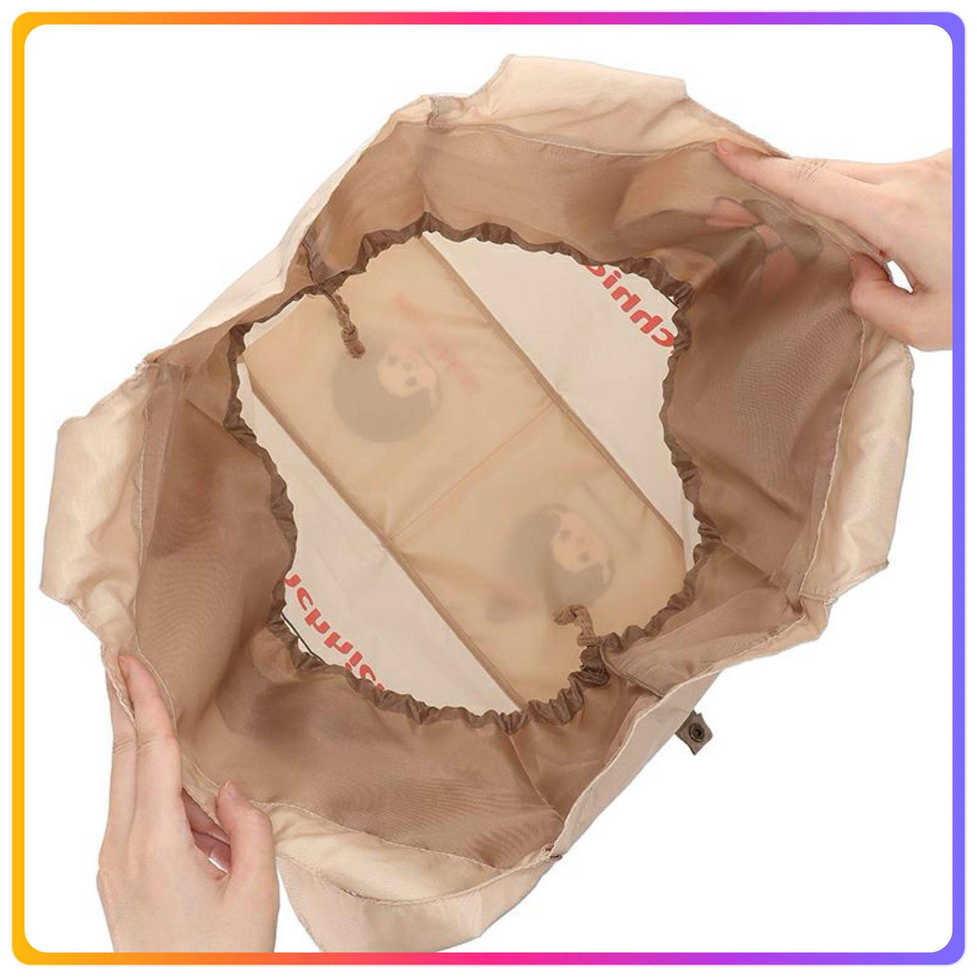 - 不易變形,容易拿 - 帶底板的寬環保袋 - 因為有抽繩,所以裡面的東西不會飛出來,攜帶也放心 - 因為可以緊湊地摺疊起來,所以很適合購物和行李增加的日子 - 尺寸:約H38×W34×D16cm